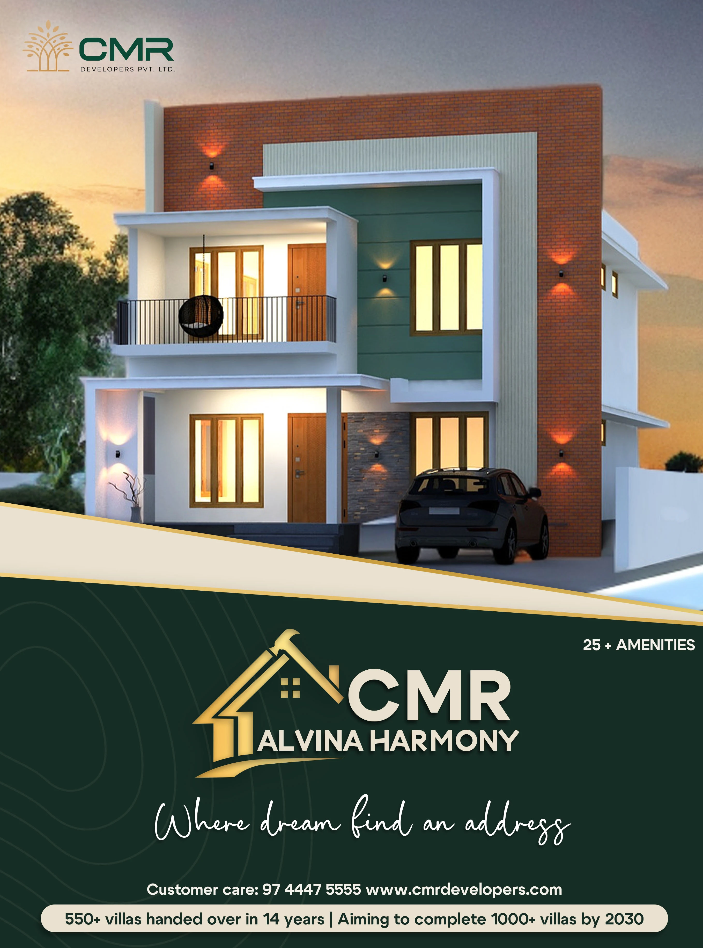 Average cost of CMR Alvina Harmony Villa is below 60% of the cost of nearby apartment. Own a beautiful villa at half the price of an apartment. CMR Alvina Harmony is located close (just 200 mtr.) to IMA Doctor's Apartment complex (Healers Haven) and offers all luxurious amenities.