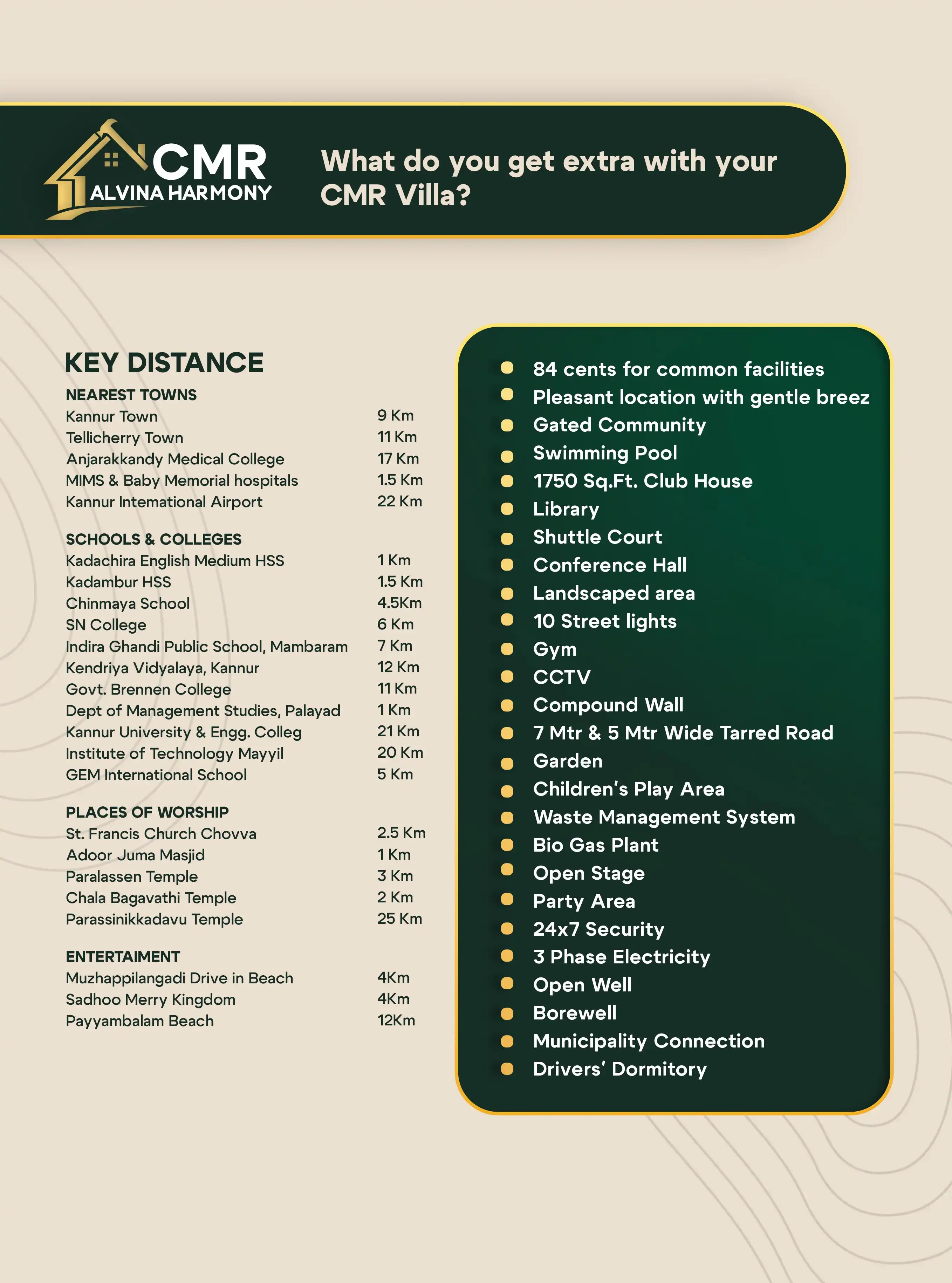 At CMR, we take pride in offering a wide range of villas for sale in Kannur, catering to diverse homeowner needs. From spacious layouts to modern amenities, our luxury villas in Kannur are designed to elevate your lifestyle. Established in the year 2012, CMR has completed 460+ luxury villas in and around Taliparamba, Kannur. With elegant vasthu designs, top quality construction and personalized customer service, CMR has become the favorite home maker of middle income families. We also take care of preserving the mother nature by giving a very strong emphasis on implementing environmental management best practices at where ever we do a construction. With the mantra of "Quality in whatever we do", today CMR is on the way to scale new horizons by fulfilling every family's dream of "My Own Home".