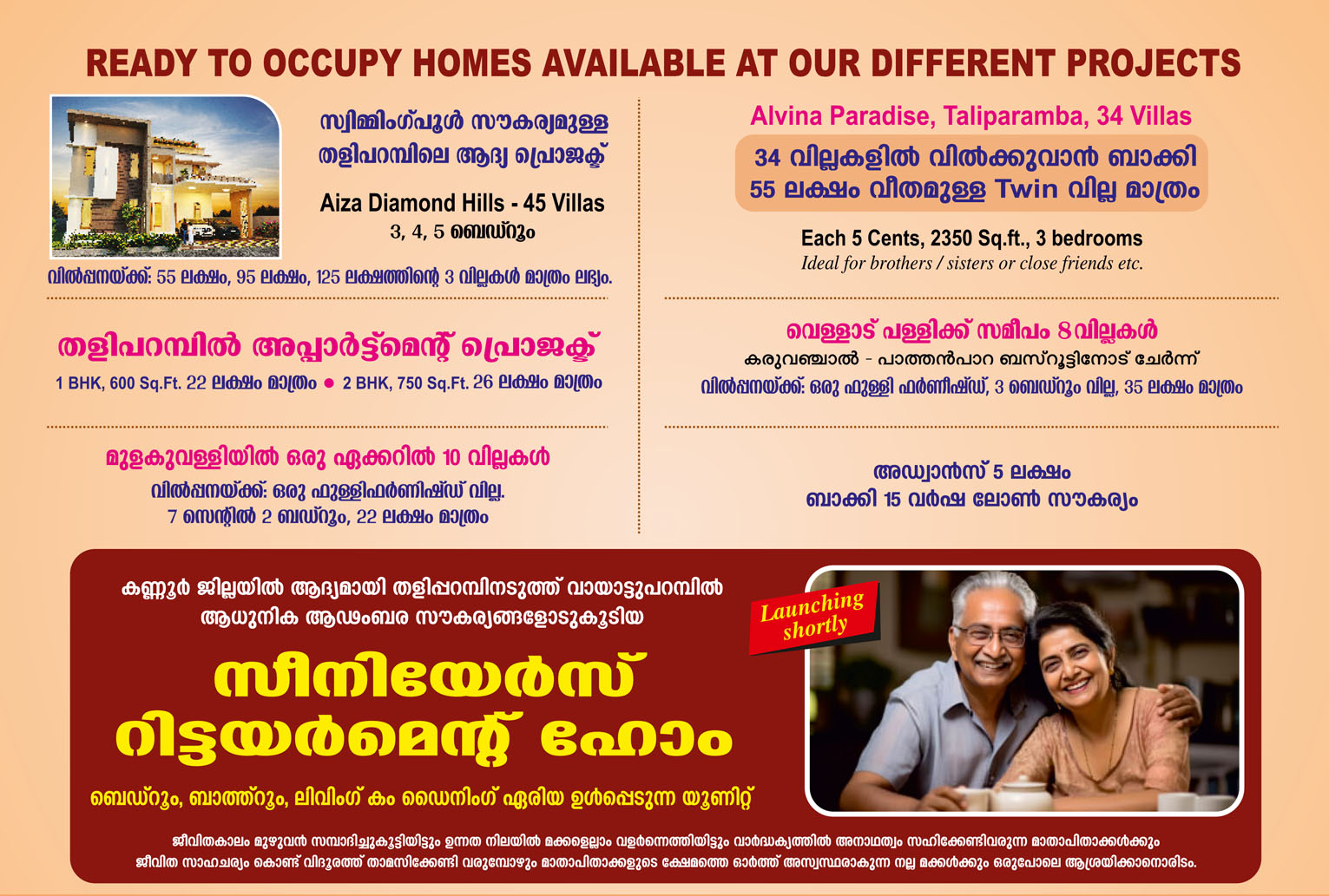 Our recently completed villa project with 90 luxury villas is developed in two phases in 10 acres of greenery. The first phase - CMR Paradise as well as second phase - Aiza Diamond Hills were fully sold out even before the project was completed. This project was in the heart of Taliparamba town with designer homes in 6 to 10 cents land ranging from 1400 to 2900 sq.ft with a choice of 3/4/5 BHK and a price range of 55 lakhs to 1.5 crore. This is the first villa project in Kannur district with swimming pool and more than 125 cents devoted for common amenities. All our villas have been handed over within scheduled time.