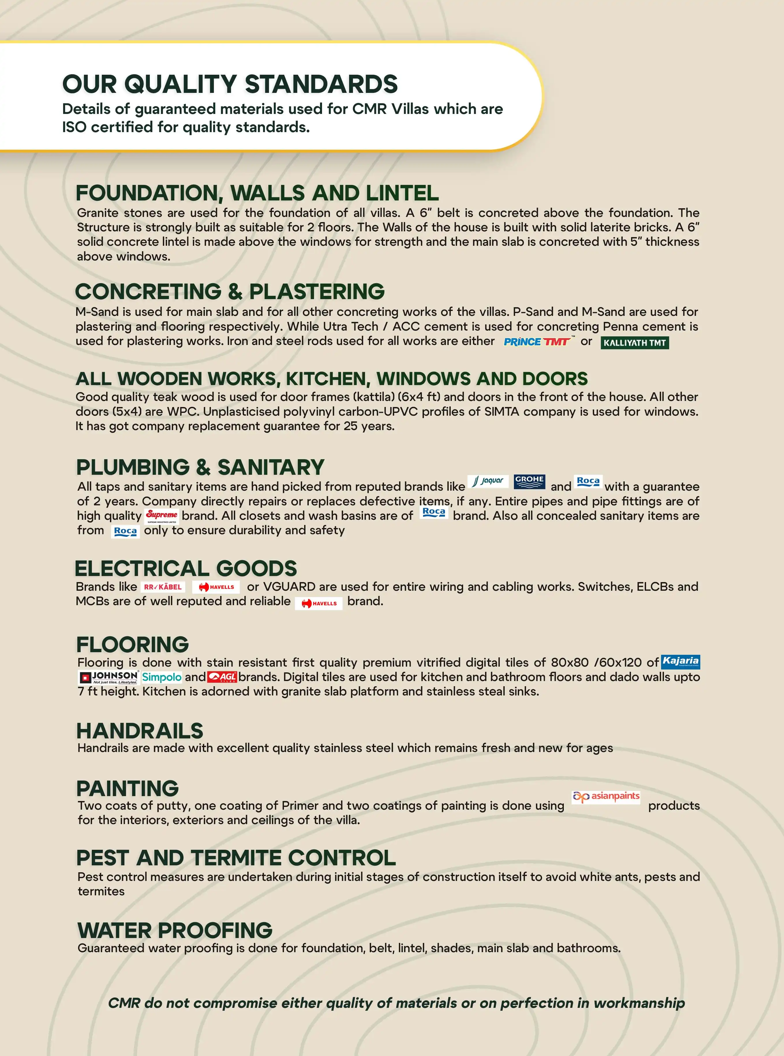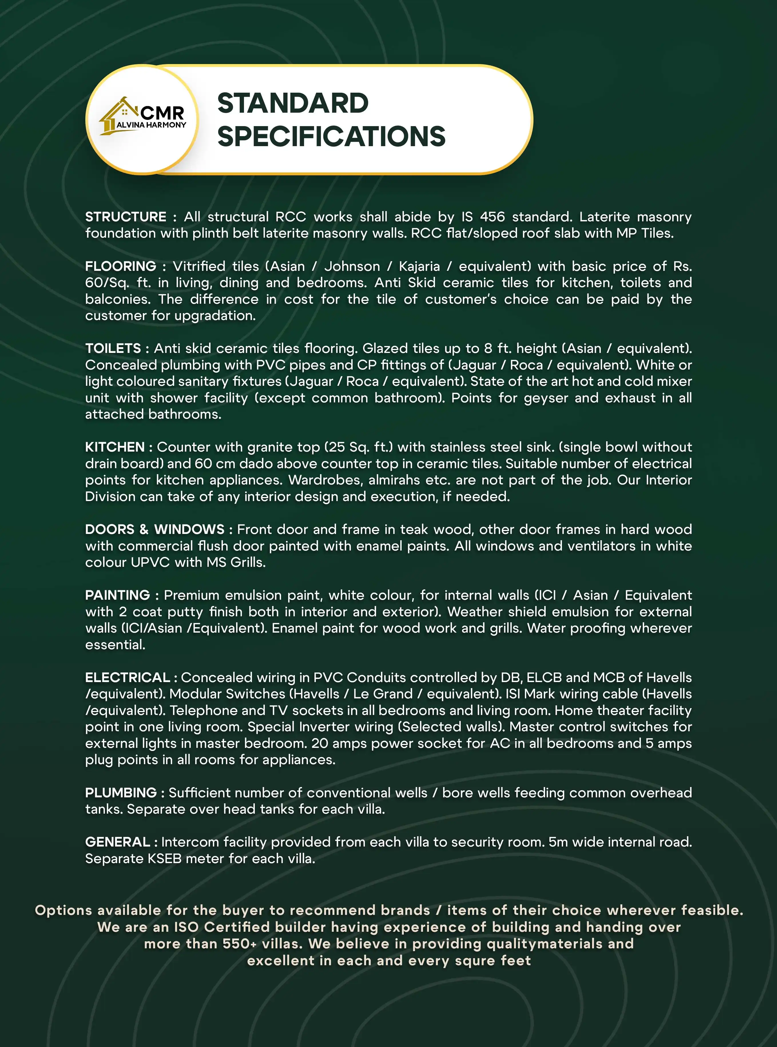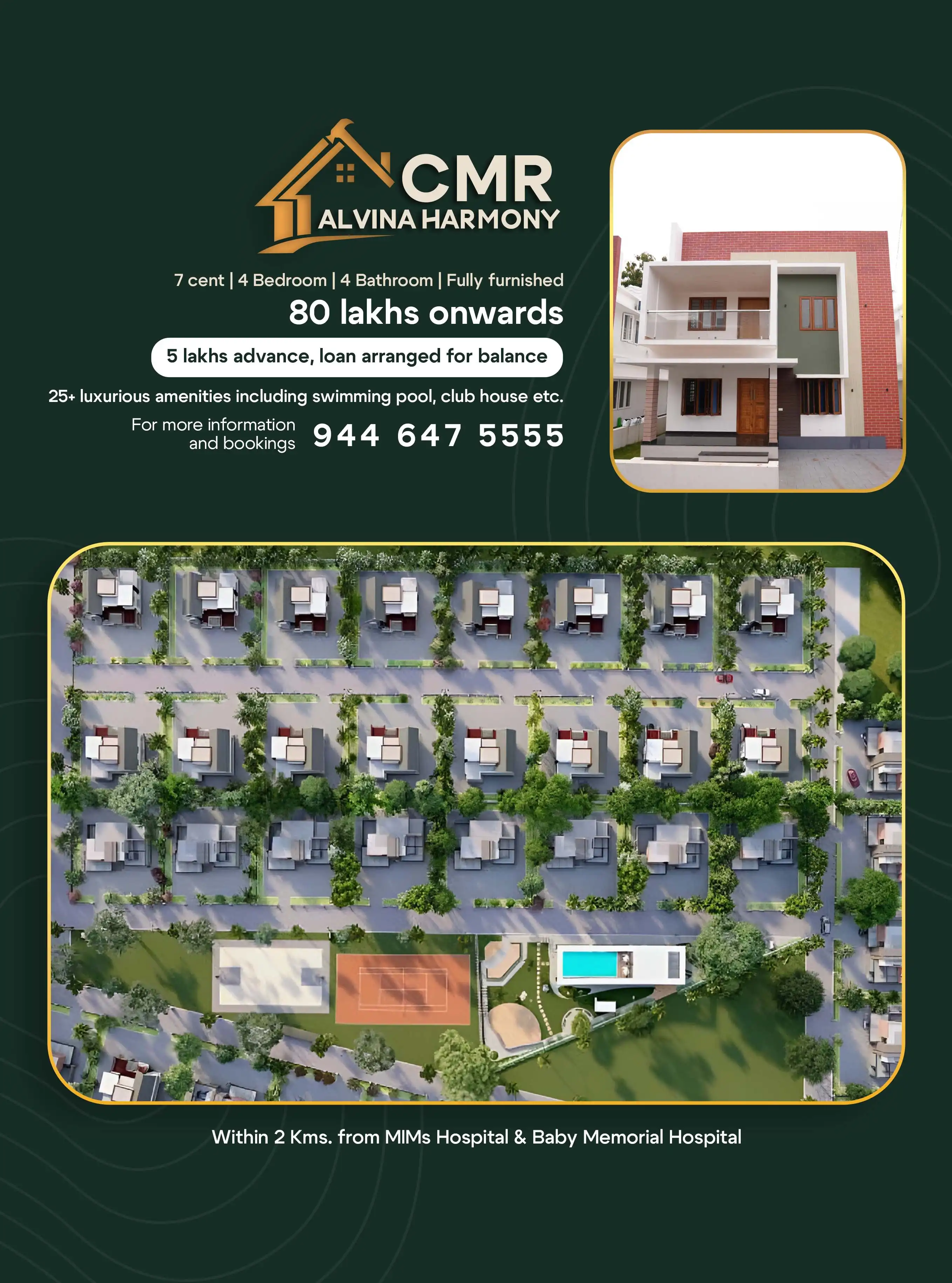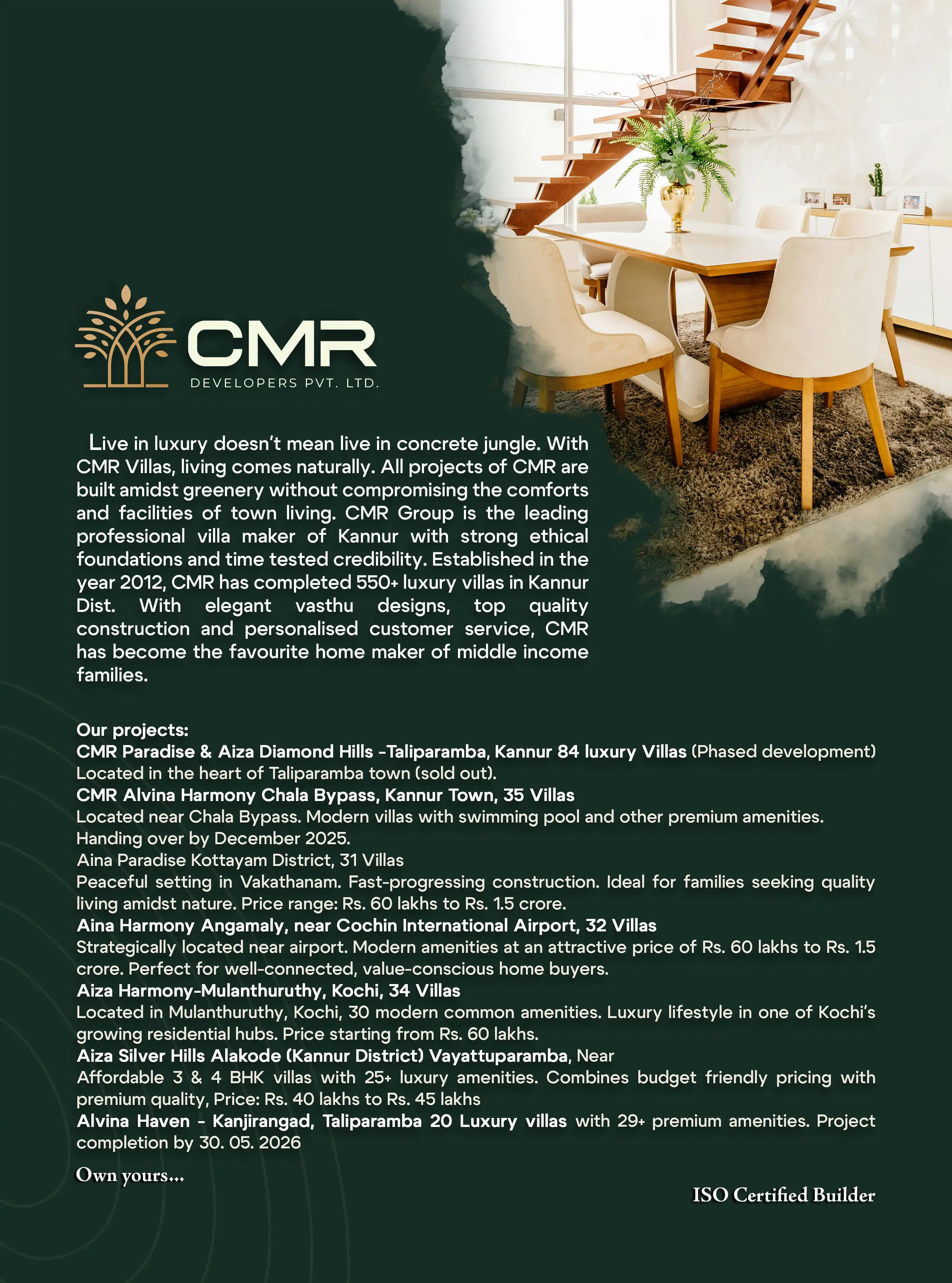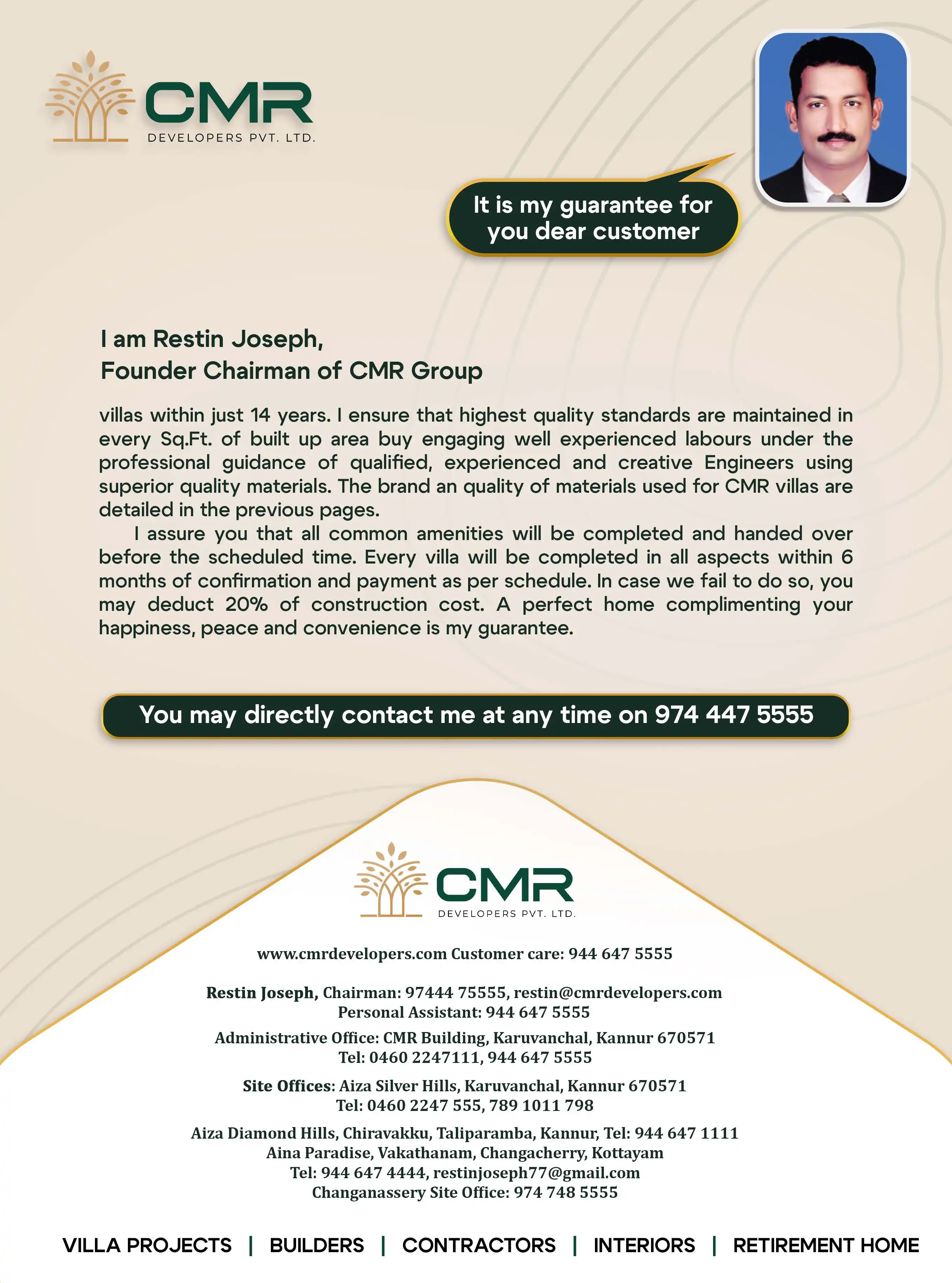 At CMR, we take pride in offering a wide range of villas for sale in Kannur, catering to diverse homeowner needs. From spacious layouts to modern amenities, our luxury villas in Kannur are designed to elevate your lifestyle. Established in the year 2012, CMR has completed 460+ luxury villas in and around Taliparamba, Kannur. With elegant vasthu designs, top quality construction and personalized customer service, CMR has become the favorite home maker of middle income families. We also take care of preserving the mother nature by giving a very strong emphasis on implementing environmental management best practices at where ever we do a construction. With the mantra of "Quality in whatever we do", today CMR is on the way to scale new horizons by fulfilling every family's dream of "My Own Home".