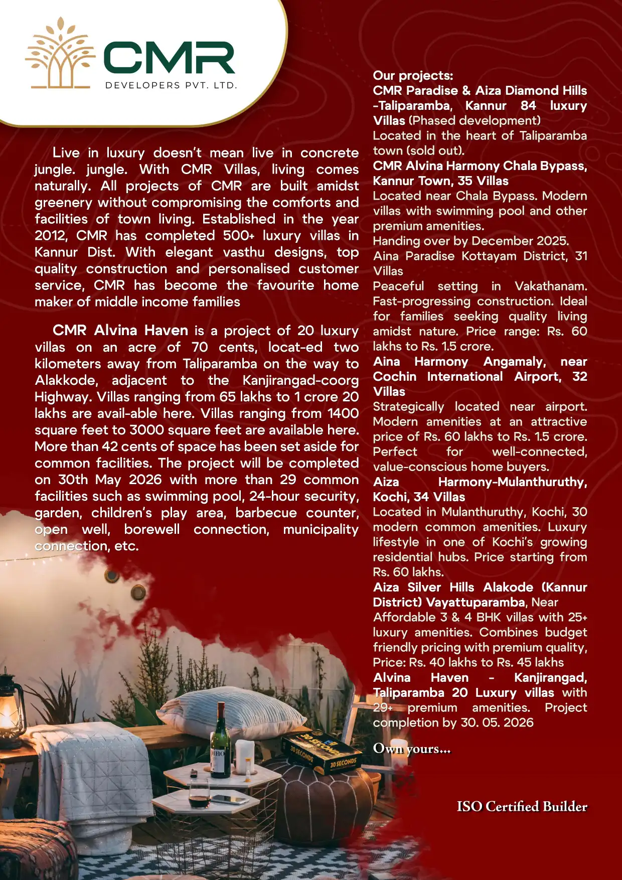 CMR Alvina Haven is a project of 20 Luxury Villas located 2 kilometers away from Taliparamba on the way to Alakkode, adjacent to the Kanhirangad-Coorg highway.