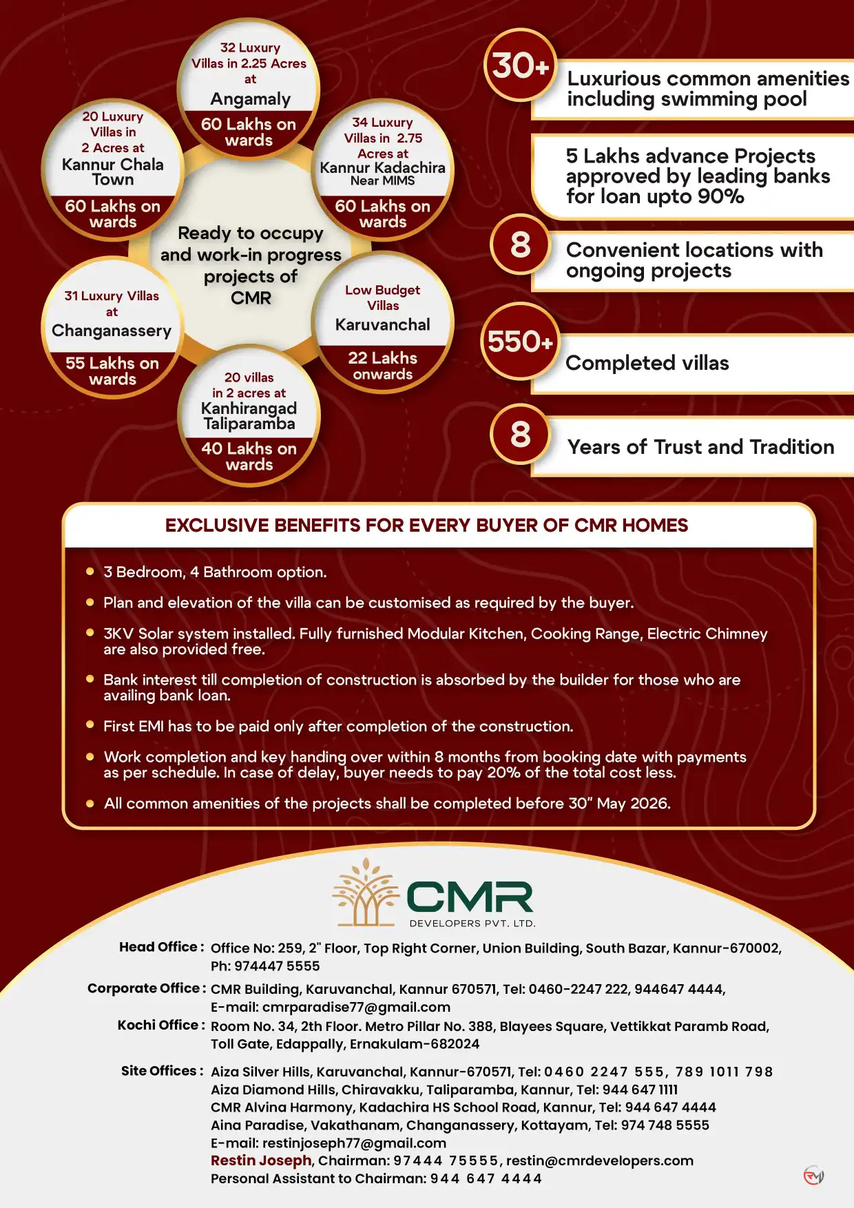 At CMR, we take pride in offering a wide range of villas for sale in Kannur, catering to diverse homeowner needs. From spacious layouts to modern amenities, our luxury villas in Kannur are designed to elevate your lifestyle. Established in the year 2012, CMR has completed 600+ luxury villas in and around Taliparamba, Kannur. With elegant vasthu designs, top quality construction and personalized customer service, CMR has become the favorite home maker of middle income families. We also take care of preserving the mother nature by giving a very strong emphasis on implementing environmental management best practices at where ever we do a construction. With the mantra of "Quality in whatever we do", today CMR is on the way to scale new horizons by fulfilling every family's dream of "My Own Home".