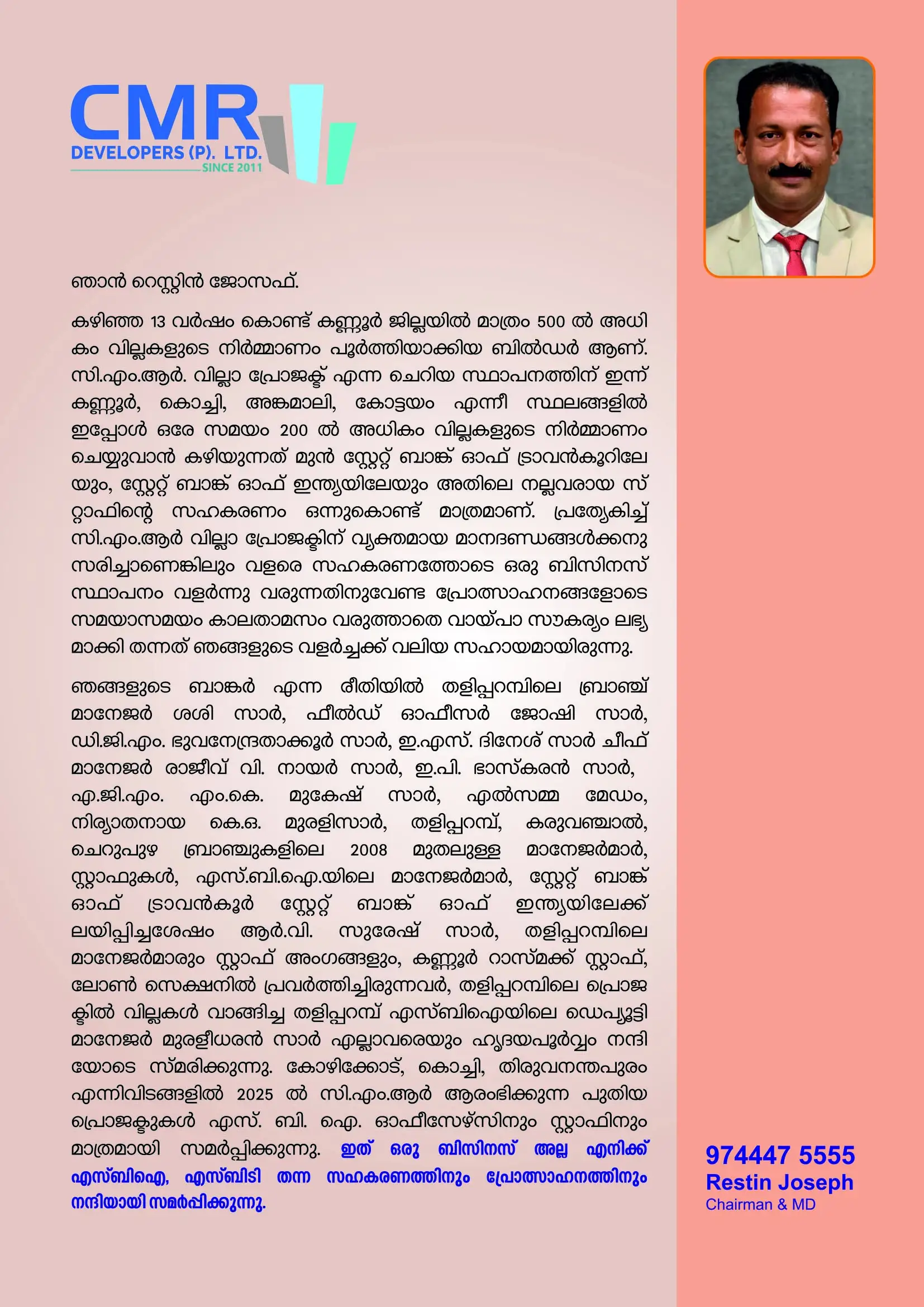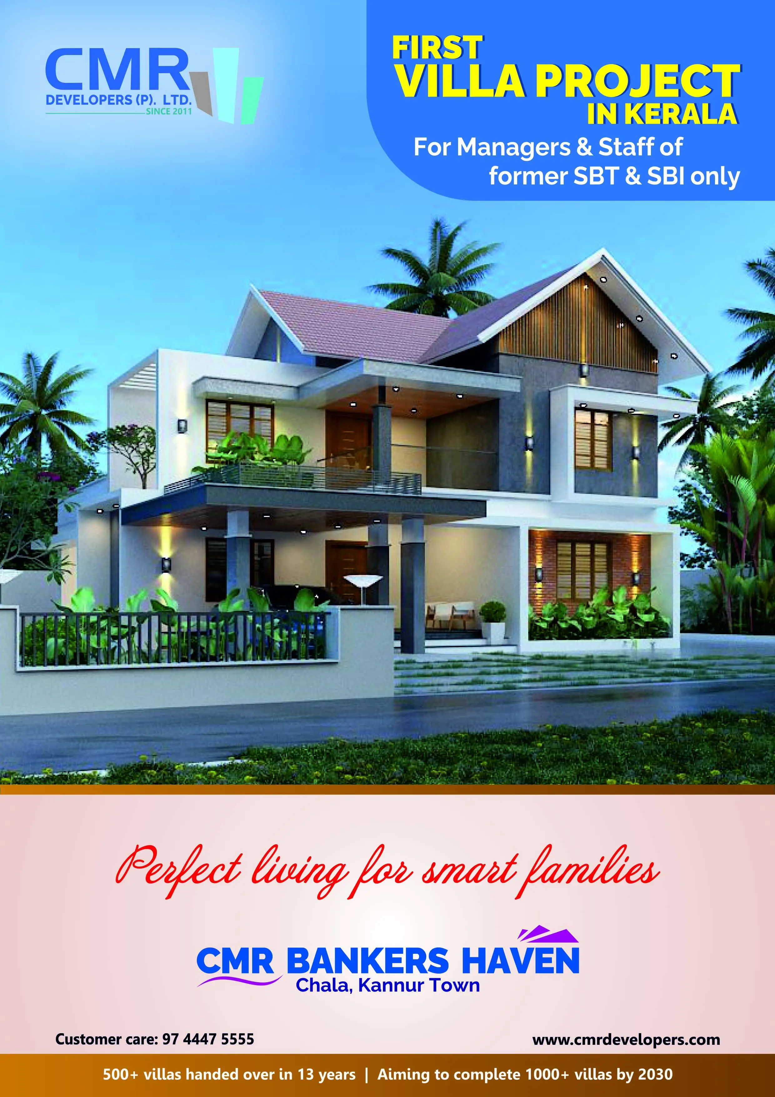 We announce the launch of an exclusive premium villa project for Managers of former SBT and SBI. This initiative represents the first project of its kind in Kerala, focusing solely on this distinguished community, with 30 most modern villas.