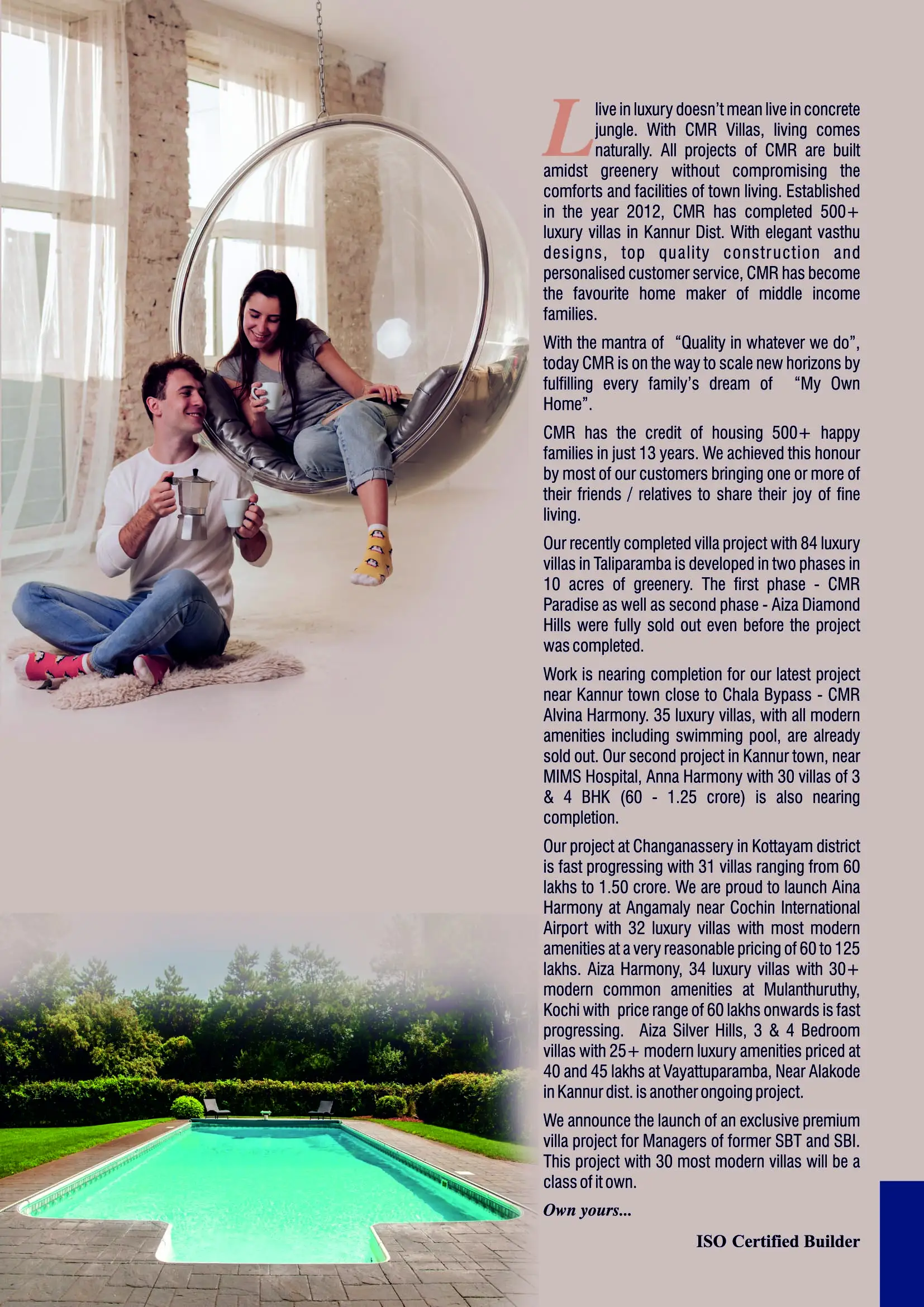 Our recently completed villa project with 90 luxury villas is developed in two phases in 10 acres of greenery. The first phase - CMR Paradise as well as second phase - Aiza Diamond Hills were fully sold out even before the project was completed. This project was in the heart of Taliparamba town with designer homes in 6 to 10 cents land ranging from 1400 to 2900 sq.ft with a choice of 3/4/5 BHK and a price range of 55 lakhs to 1.5 crore. This is the first villa project in Kannur district with swimming pool and more than 125 cents devoted for common amenities. All our villas have been handed over within scheduled time.