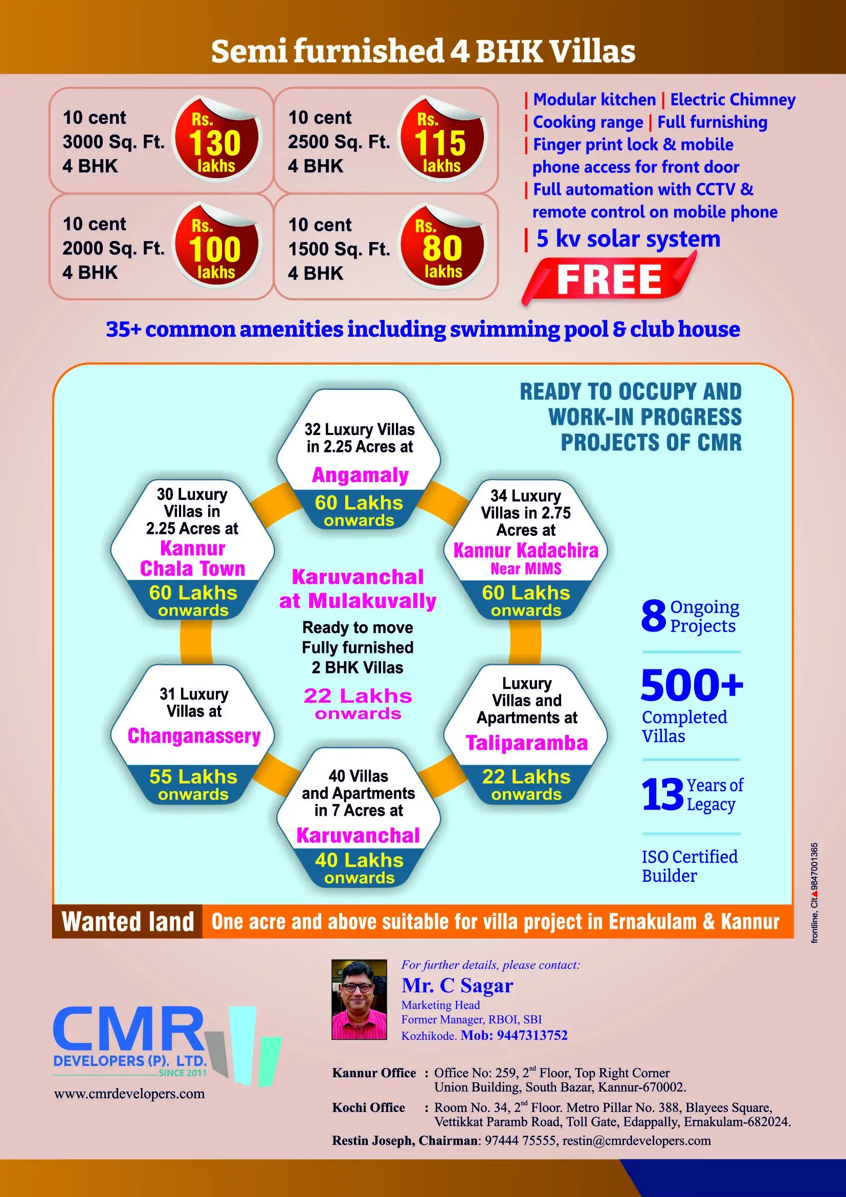 At CMR, we take pride in offering a wide range of villas for sale in Kannur, catering to diverse homeowner needs. From spacious layouts to modern amenities, our luxury villas in Kannur are designed to elevate your lifestyle. Established in the year 2012, CMR has completed 550+ luxury villas in and around Taliparamba, Kannur. With elegant vasthu designs, top quality construction and personalized customer service, CMR has become the favorite home maker of middle income families. We also take care of preserving the mother nature by giving a very strong emphasis on implementing environmental management best practices at where ever we do a construction. With the mantra of "Quality in whatever we do", today CMR is on the way to scale new horizons by fulfilling every family's dream of "My Own Home".